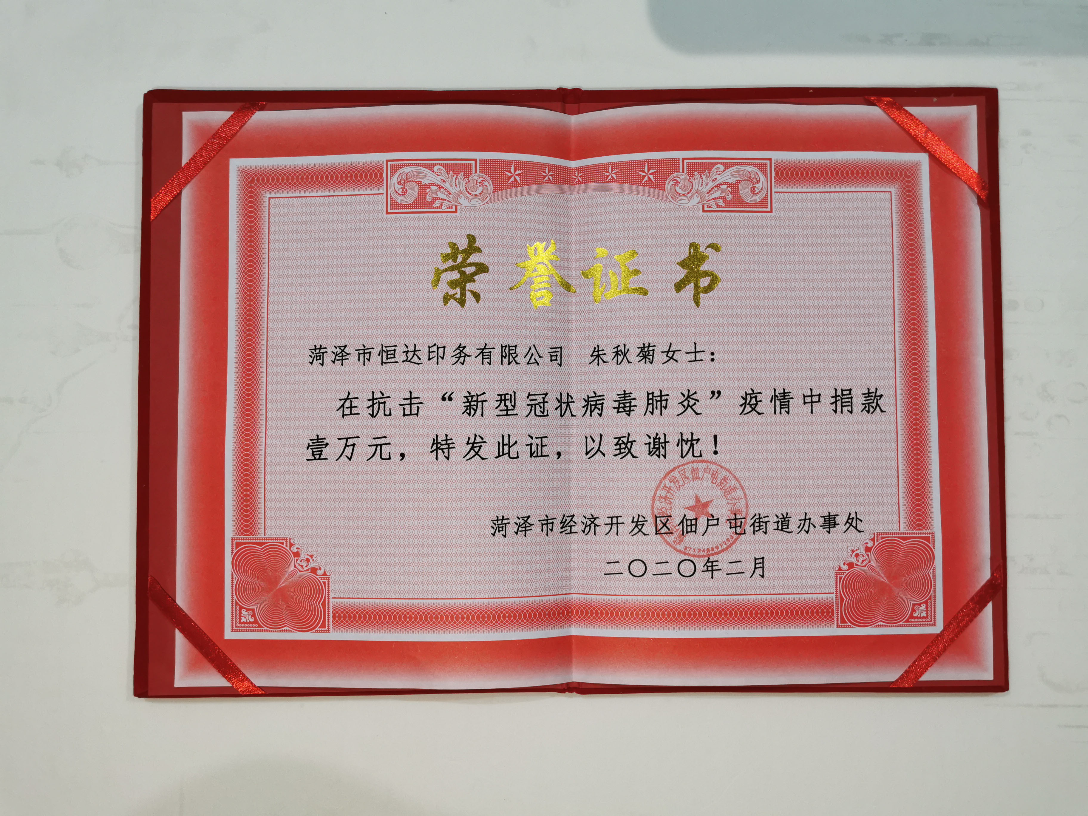 2020年恒达印务朱秋菊女士在抗击"新型冠状病毒肺炎"疫情中捐款一万元。